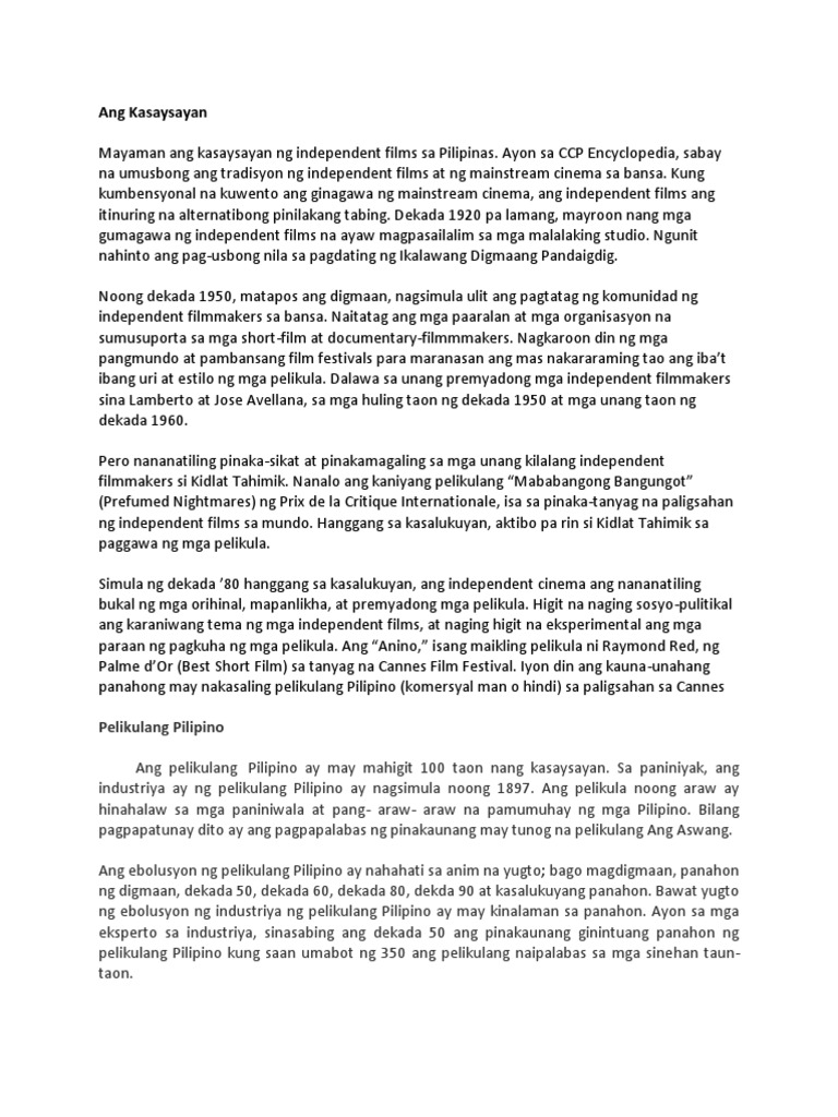 Ang pelikulang Pilipino ay itinuturing pinaka batang uri nang sining sa Pilipinas at itinuturuing isang libangan. At noong 1910 ang unang pelikula na may tunog ay nakarating sa Manila sa kagamitan na Chronophone ang mga Briton na kumukuha ng pelikula ay pumunta sa Pilipinas at kumuha ng Magagagandang tanawin sa Pilipinas tulad sa talon ng Pagsanjan noong 1911 ng Kinemakolor At noongv 1912 ang isang kumpanysa sa Hollywood ay gumawa ng isa ng Pelikula na ang pamagat ay La Vida de Rizal na tungkol sa. 2 question Anong pinaka unang bayani sa pilinas.